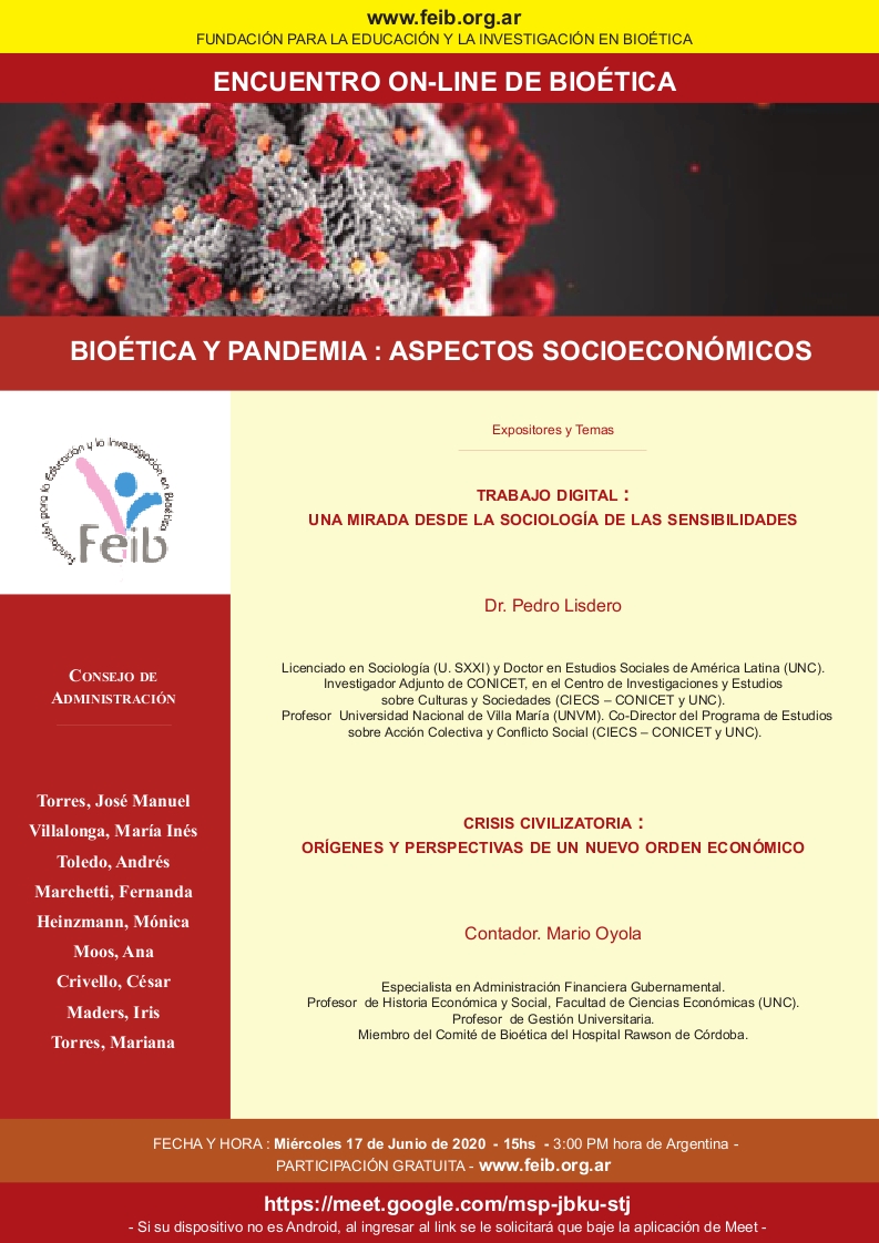 : ENCUENTRO ON-LINE DE BIOÉTICA. BIOÉTICA Y PANDEMIA: ASPECTOS SOCIOECONÓMICOPor Admin Feib / 8 junio, 2020