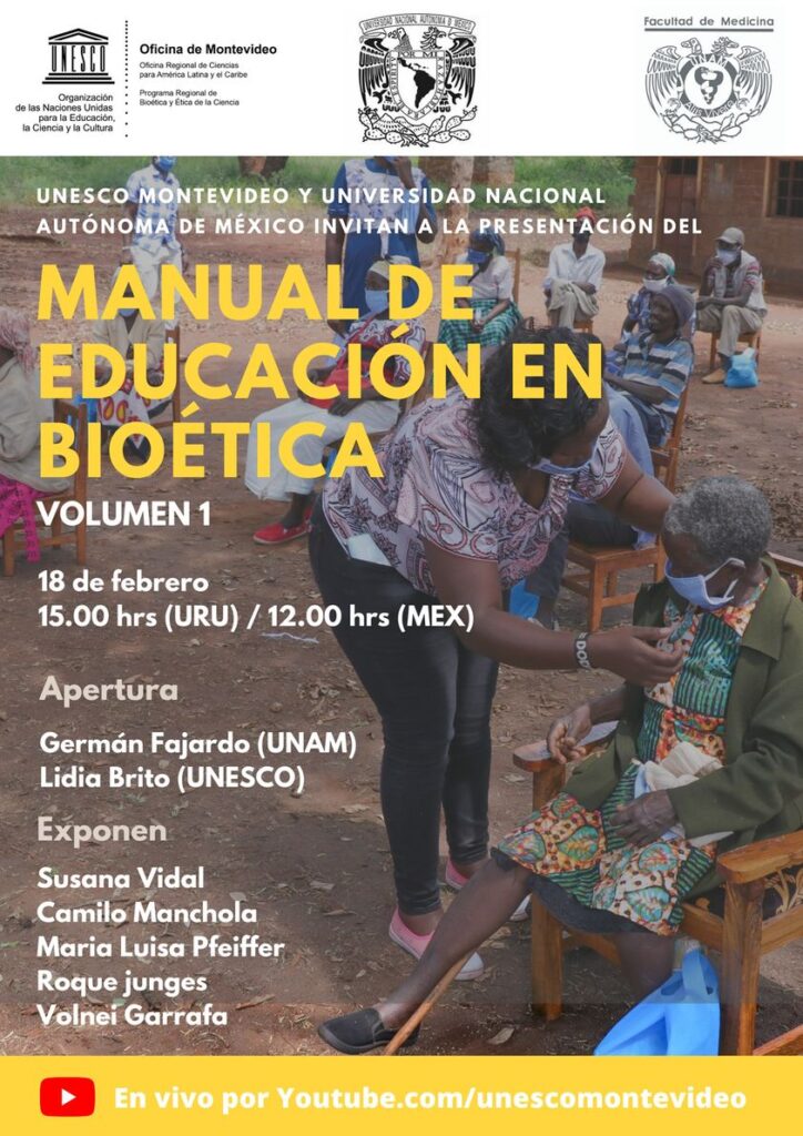 Compartimos la invitación para la presentación del MANUAL DE EDUCACIÓN EN BIOÉTICA VOLUMEN I. FECHA: 18 FEBRERO 15hs (URU) 12hs