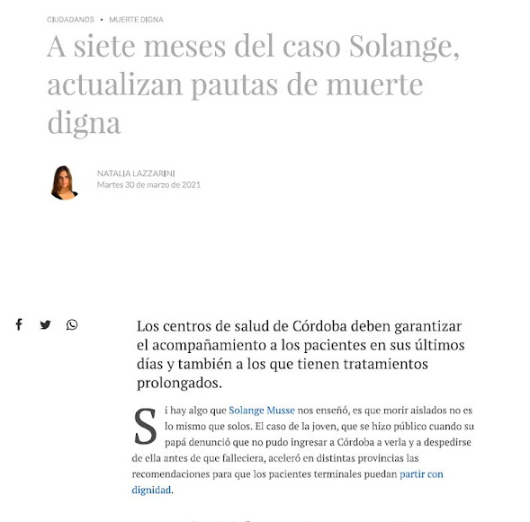 Noticia de la voz del Interior. “A siete meses del caso Solange, actualizan pautas de muerte digna”