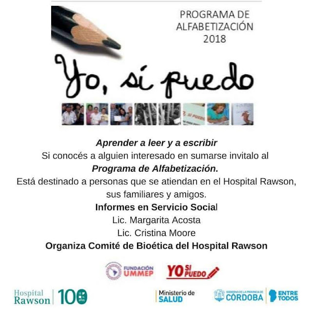 Próximamente dará inicio en el Hospital Rawson, el “Programa de Alfabetización 2018”. Está destinado a personas que reciban atención de salud en esta institución,sus familiares y amigos y que quieran aprender a leer y a escribir.